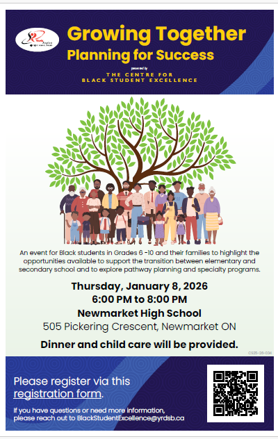 We are excited to invite Black students and their families in Grades 6 through 10 to an upcoming event highlighting the opportunities available to support pathway planning, specialty programs, and the transition between elementary and secondary school.