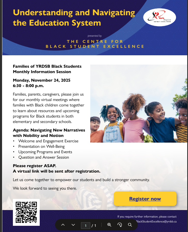 For more information, please contact the Centre for Black Student Excellence (CBSE) at blackstudentexcellence@yrdsb.ca.