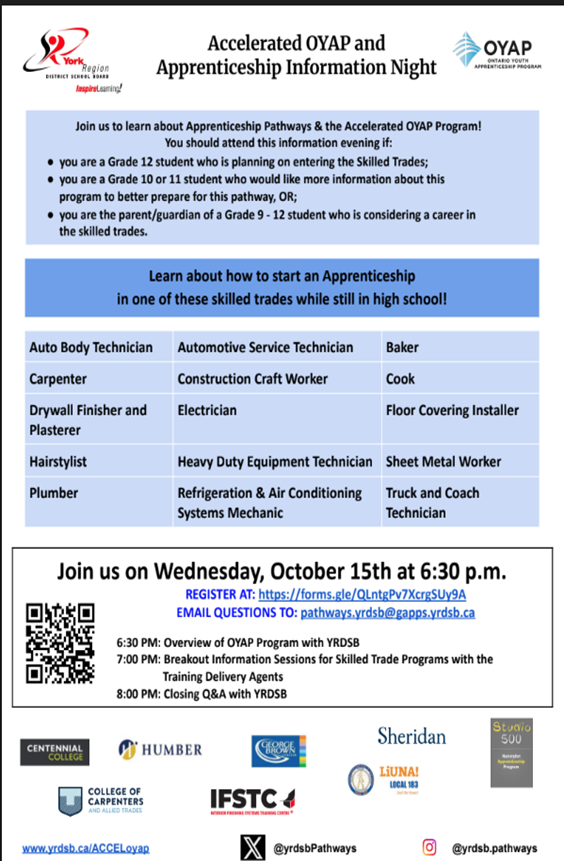 - Oct 22: Enercare Centre -Explore careers in under-represented fields for female students. Bus leaving school at 2:00 pm
