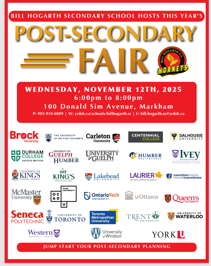 - November 12: Post-Secondary Fair hosted by Bill Hogarth SS from 6-8 pm